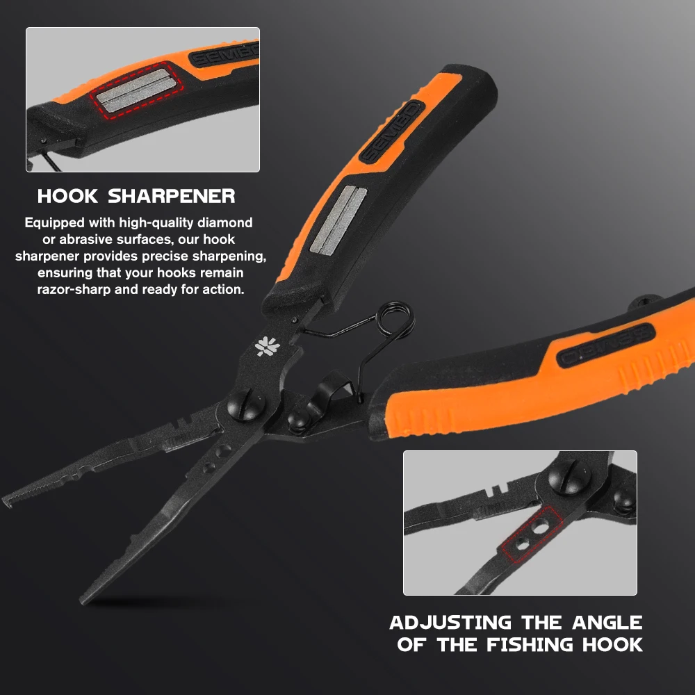 ③This plier features an integrated diamond-impregnated hook sharpener, providing high wear resistance and efficient grinding. It quickly restores the sharpness of fishing hooks, enhancing your catch rate. Regular maintenance extends its lifespan and reduces replacement frequency.