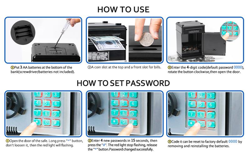 2. Please replace batteries regularly. The piggy bank usually works for about 1 month when new batteries are installed.
